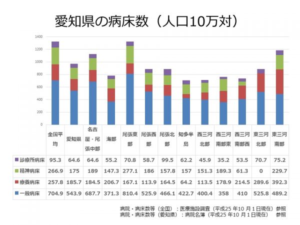 愛知県の病院、診療所は全国平均と比べて人口に対して少ないです。